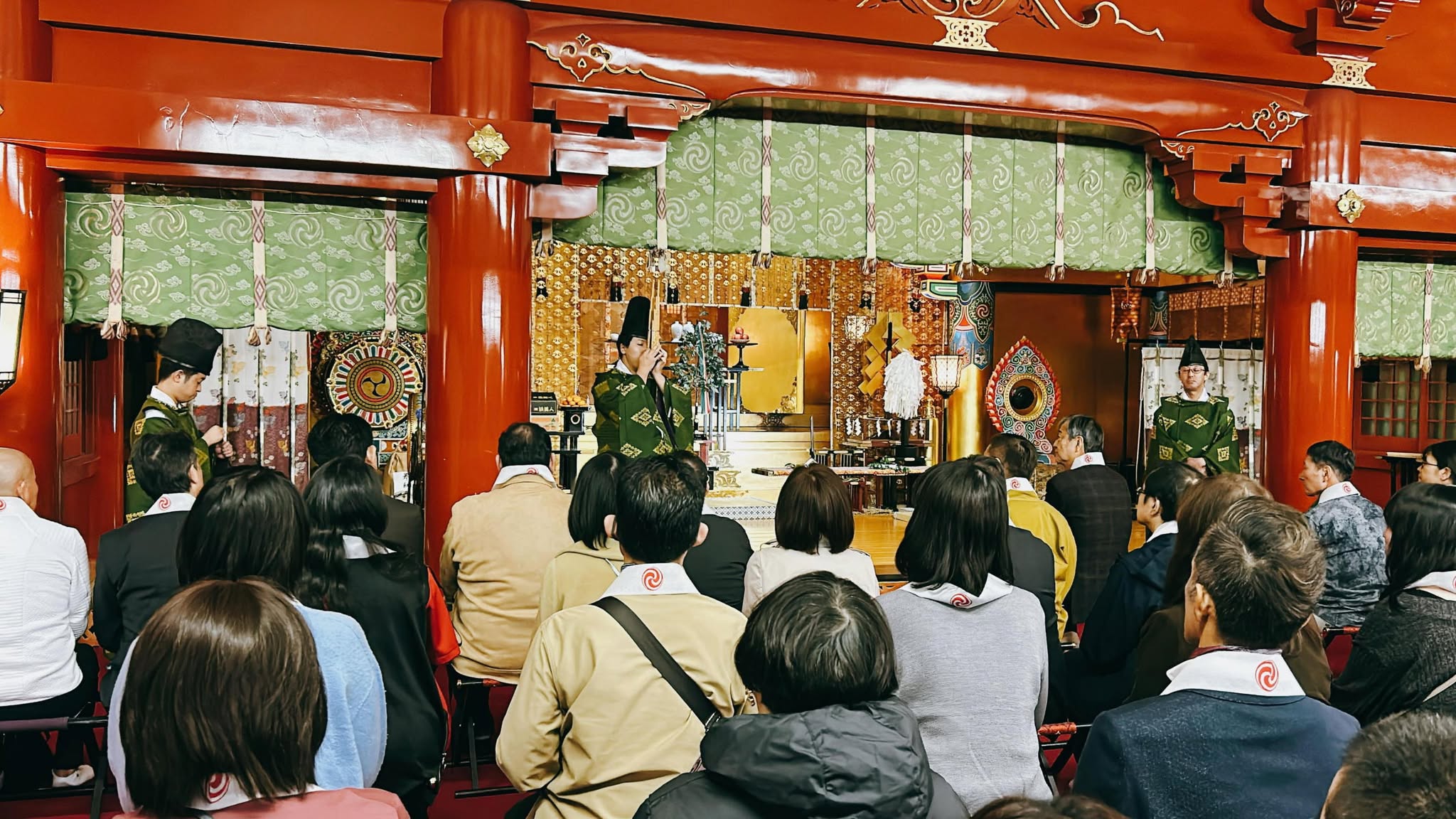 神田明神の本殿に上がってご参拝いただきます(雅楽の生演奏、美しい巫女舞)